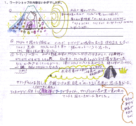 Aクリスタルの様々な個性やヒーリング、リーディングの場合の並べ方、使用方法を学べ、これから是非、クリスタルさん方と共に一緒にやっていこうと思った。しかし、頭と体が重くなった。