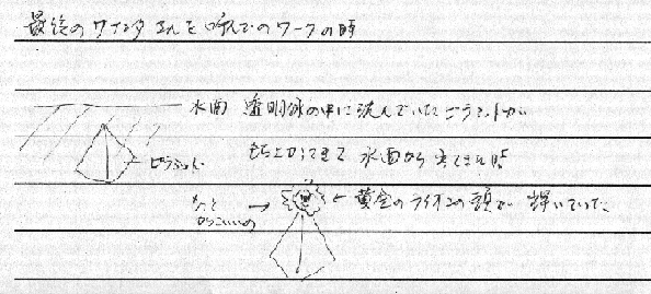 ・最後のサナンダさんを呼んでのワークの時、透明な水の中に浮かんでいたピラミッドが持ち上がってきて、水面から出てきたとき、黄金のライオンの頭が輝いていた。サナンダさんにはいろいろ悲しませて申し訳なく思っております。