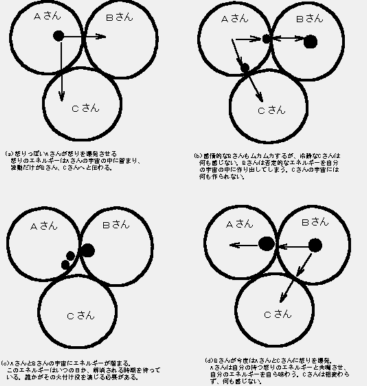 フランクさんのセミナーを受けた人なら聞いたことがあるかもしれません。「自分は誰からも傷つけられることはない」と。これについて説明してみましょう。怒りっぽいAさんと感情的なBさん、冷静なCさんが集まっています。Aさんが話の途中で、爆発しました(a)。その怒りのエネルギーはBさんとCさんを直撃したように見えます。Bさんは「Aさんに傷つけられた」と解釈し、多くの人に同情を求めます。でも、Cさんは何も感ずることはありませんでした(b)。さて、Aさんの発したエネルギーは実際にはBさんやCさんには入らず、波動だけが伝わります。エネルギーそのものはAさんの宇宙の中に留まっています。Bさんに伝わった波動はBさんに怒りを起こさせ、Bさんの宇宙に作られてしまいました。Cさんには何も作られませんでした(c)。AさんとBさんには解消されるべきエネルギーが留まっているので、いつの日か、これが解消されるような現象が必ず起こります。