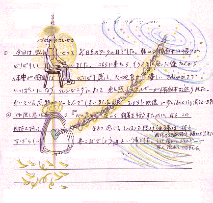 ・神からエネルギーをいただいたとき、ぐんぐん体の中へ入っていくのを感じ、その後、胸と頭のあたりから丸い光の輪が広がっていき、それが一つになって体を包んだとき、「私は神である」と心から言いたい気がした。自分でシナリオを作っているということが実感できた。